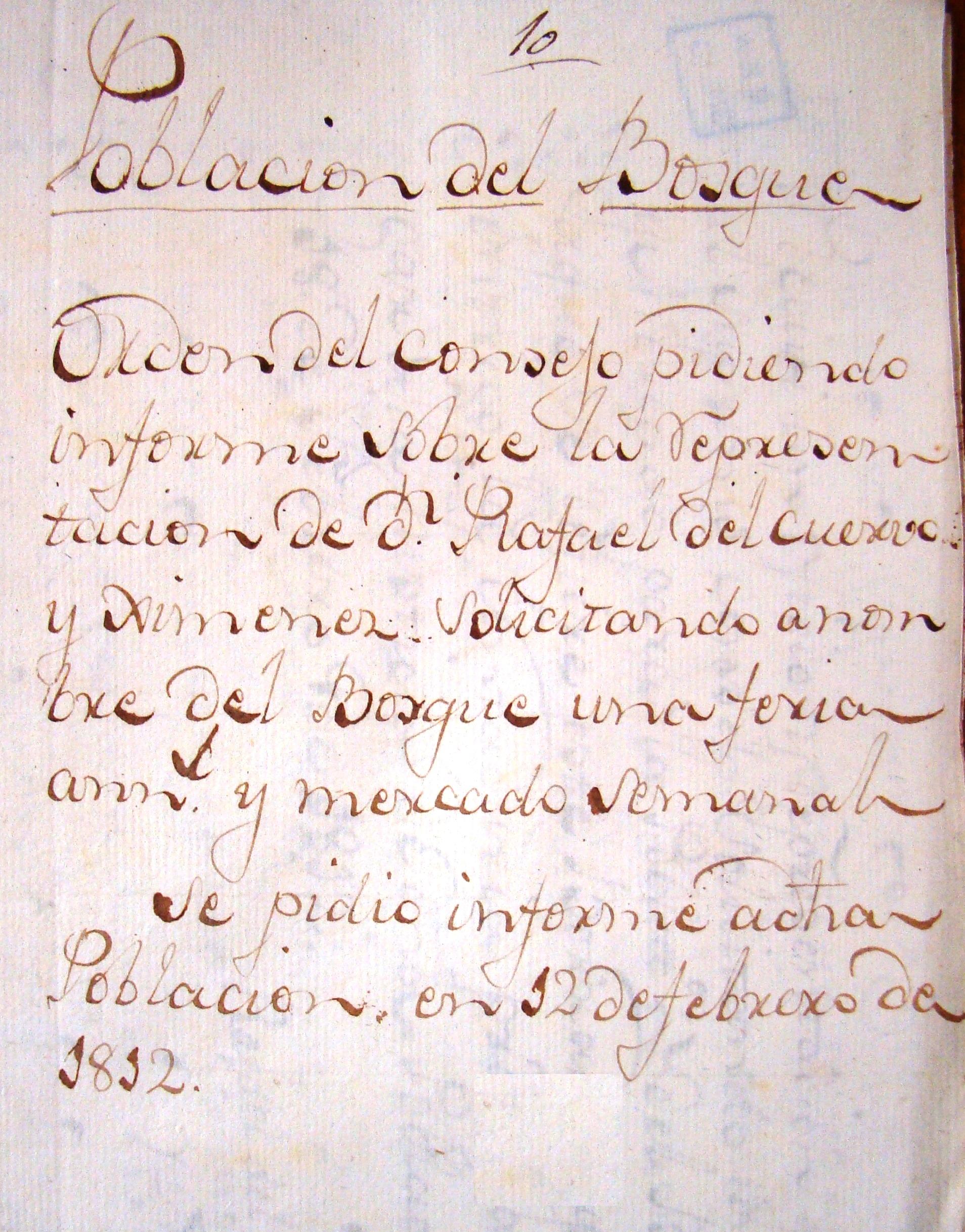El Intendente, al carecer de datos concretos de lo que se le solicitaba, envió un escrito, fechado el 12 de febrero de 1812, a través de D. Rafael del Cuervo al Sr. Alcalde mayor o Justicia ordinaria de la Población del Bosque; en él se decía: