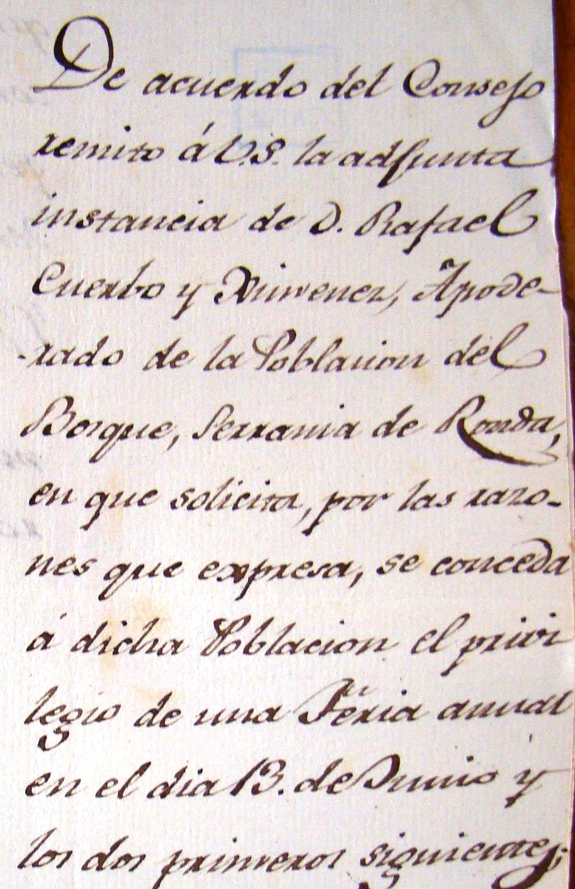 En ese escrito, dirigido al Sr. Yntendente de los quatro Reinos de Andalucía y fechado el 6 de febrero de 1812, D. Santos Sánchez le decía que le adjuntaba la instancia de D. Rafael Cuerbo y Ximénez, que ejercía en ese momento de Apoderado de la Población del Bosque, en la que solicitaba (…) por la razones que expresa, se conceda a dicha Población el privilegio de una Feria anual en el día 13 de Junio y los dos primeros siguientes. Supongo que entre las razones que expresó, D. Rafael del Cuervo haría mención a las mismas que quince meses antes (17 de noviembre de 1810) había argumentado para solicitar el Privilegio de Villazgo para El Bosque (3) pero centrándose especialmente en la maltrecha economía en un pueblo que aun estaba en guerra y que acababa de Independizarse.