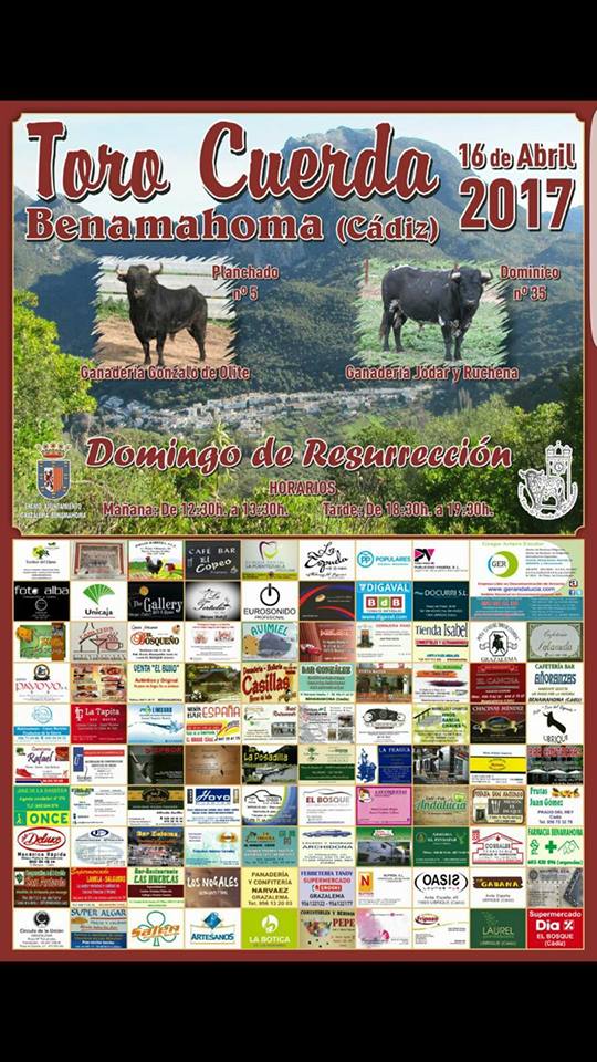 El domingo 17 de abril de 2017 se celebra el Toro de Cuerda Benamahoma 2017. La suelta de toros tiene diferentes horarios, uno por la mañana y otro por la tarde. El primero tendrá lugar a las 12:30h y el segundo a las 18:30h. Siendo el primer toro el más multitudinario y acaparar más visitantes.